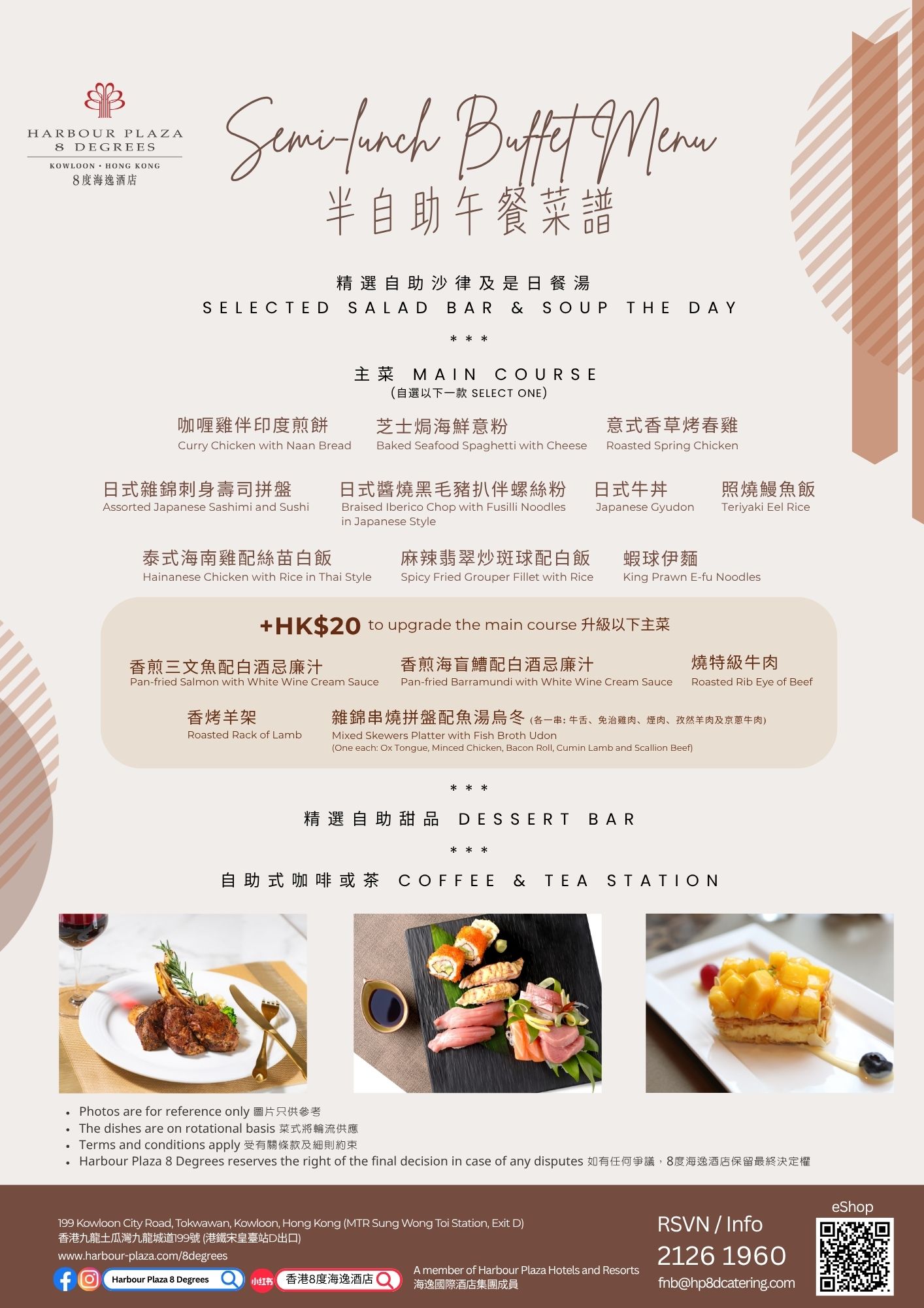 Forget the midday rush! Embark on a 2.5-hour Semi-lunch Buffet journey at Café 8 Degrees. Indulge in a selection of gourmet salads, classic soups and exquisite desserts from the buffet, while enjoying a specially prepared main dish cooked to order by our Executive Chef. Whether for a business gathering or a leisurely get-together with friends and family, it’s the perfect choice.