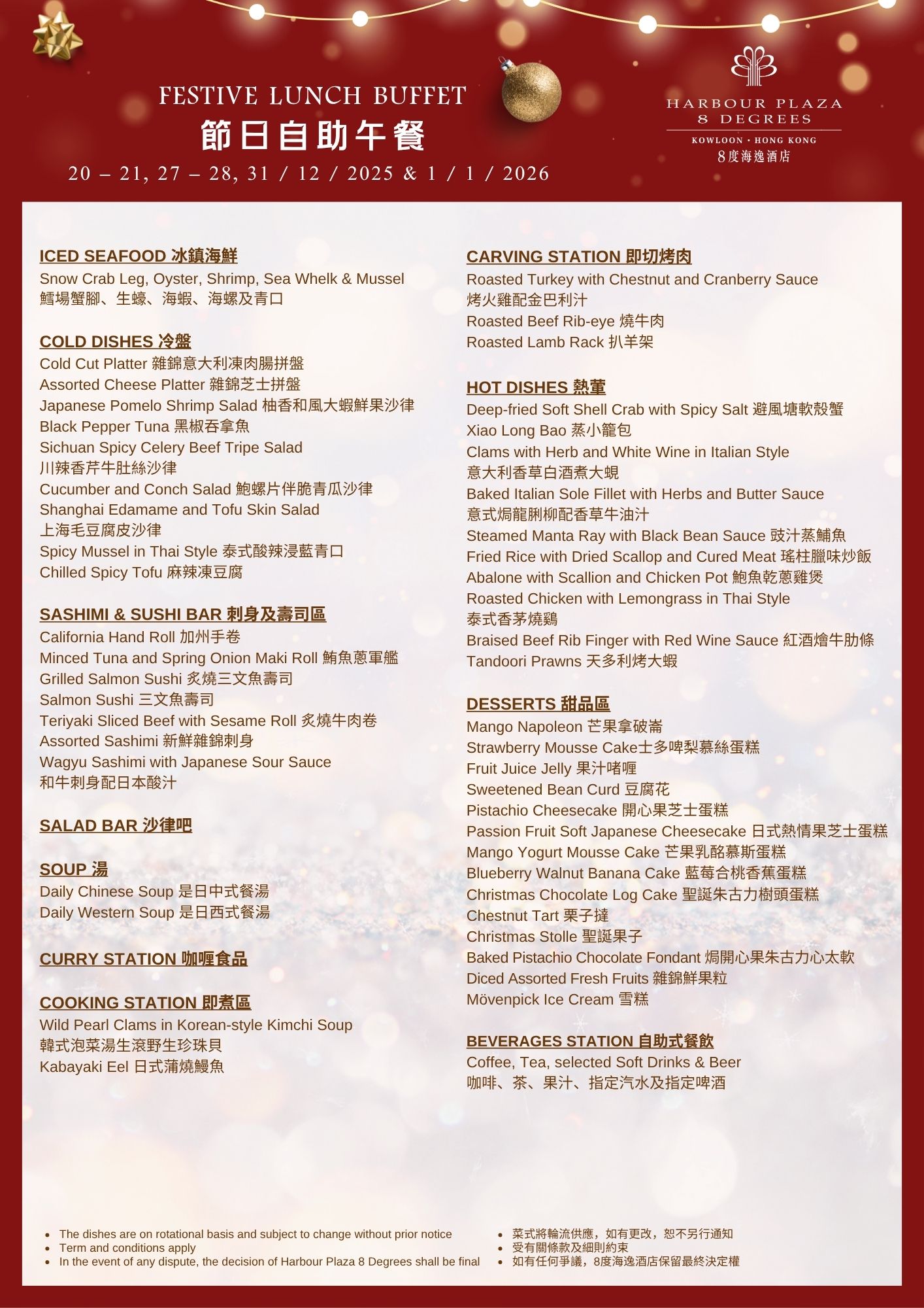 在温馨璀璨的圣诞氛围中,与挚爱亲朋共聚,悦享节日午餐盛宴!从新鲜海鲜到匠心烹製的节日特色佳餚,更有琳琅满目的节日精緻甜品,这个圣诞,於8度餐厅缔造难忘的节日饗宴回忆。