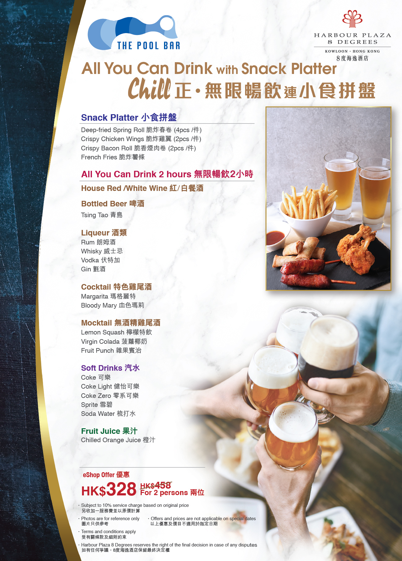 池畔廊推出「Chill正‧无限畅饮连小食拼盘」优惠,於舒适环境下享用无限畅饮指定餐酒、啤酒及特色鸡尾酒等连小食拼盘,尽情投入美好的微醺时光!