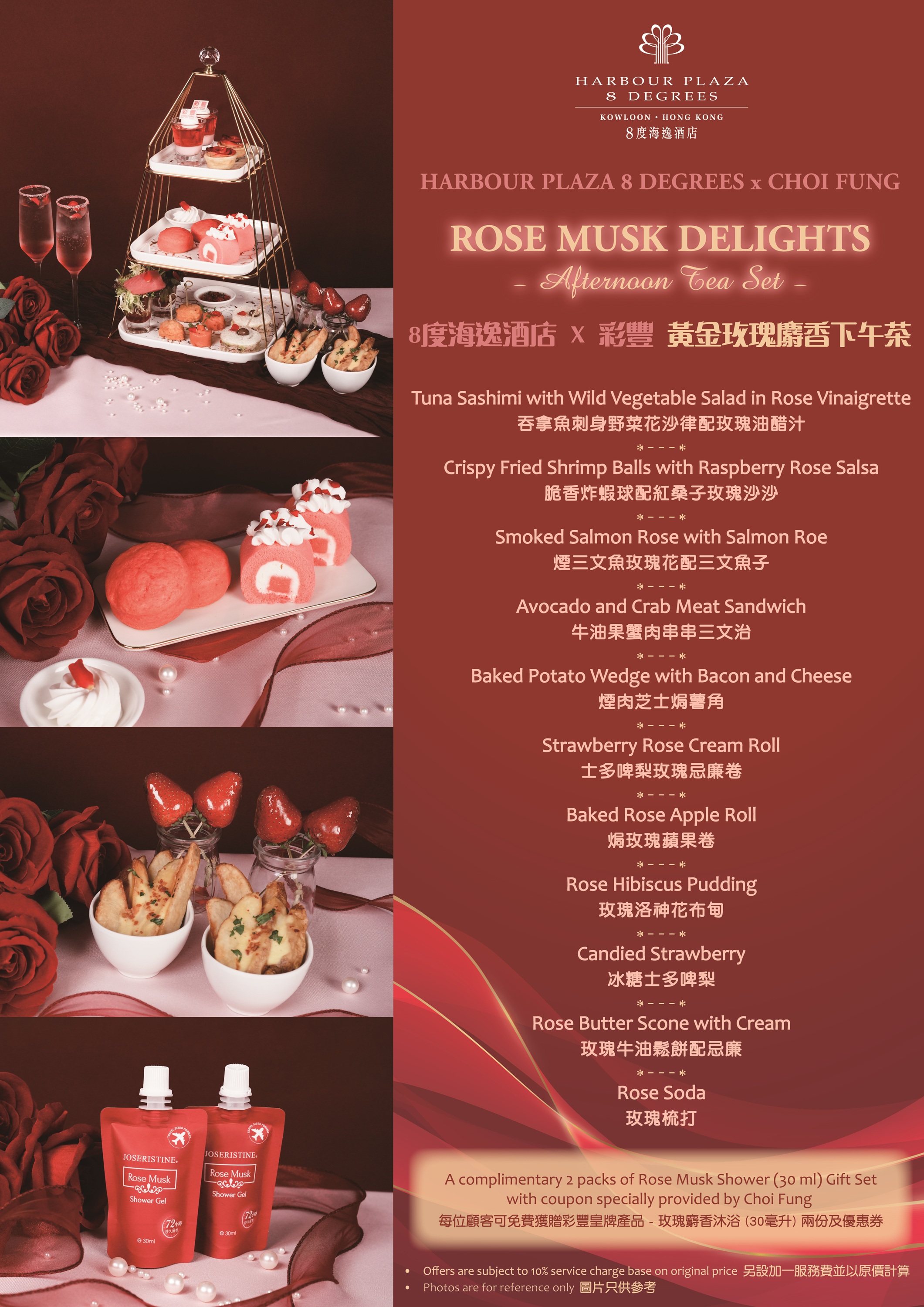 •每位顧客可免費獲贈彩豐皇牌產品 – 玫瑰麝香沐浴(30毫升)兩份及優惠券