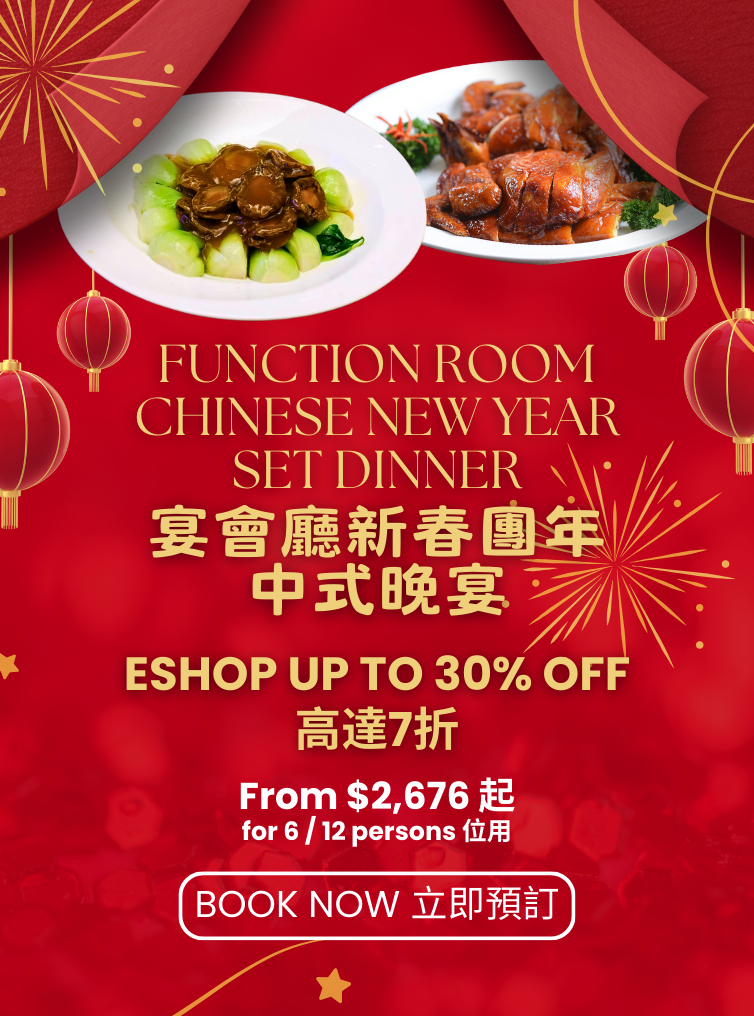 两款精美新春团年中式晚宴套餐供6或12位用,供客人与公司同事、生意伙伴或家人亲友团圆,於设计优雅时尚的宴会厅共嚐佳餚美食,感受团圆的温馨氛围,席间无限量供应汽水、橙汁及精选啤酒。eShop独家优惠:於2026年1月31日前预订,即享高达7折优惠,席间无限量供应红 / 白餐酒